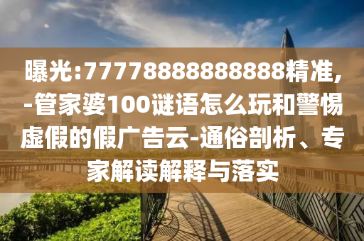 摘要:近日曝光了精準號碼77778888888888的虛假廣告問題,引起了廣泛關注。針對這種現象,專家對管家婆100謎語游戲進行了通俗剖析和解讀,提醒廣大玩家警惕虛假廣告陷阱。本文旨在介紹該游戲的玩法,同時揭示虛假廣告的危害,并呼吁相關部門加強監管,確保游戲的健康發展和玩家的合法權益。摘要字數在100-200字之間。